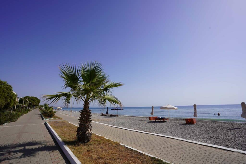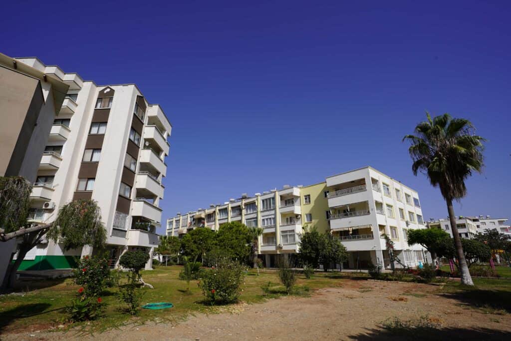 Yeşil alanlar palmiye ağaçları ve deniz manzarasıyla çevrili site huzur dolu bir atmosfer sunar