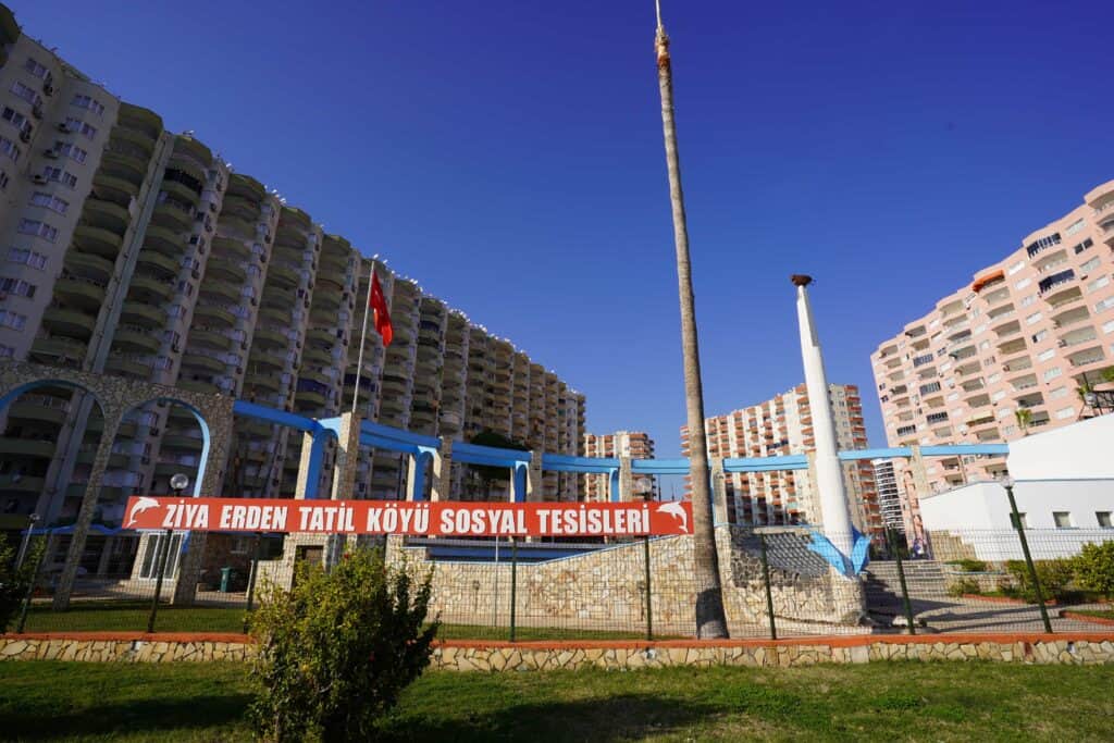 Das Ziya Erden Feriendorf liegt direkt am Meer und bietet Erholung und Unterhaltung für alle Altersgruppen Mit Aquapark Außenpool Kinderspielplatz und Cafeteria ist es eine ideale Wahl für Familien die einen angenehmen Urlaub am Meer verbringen möchten